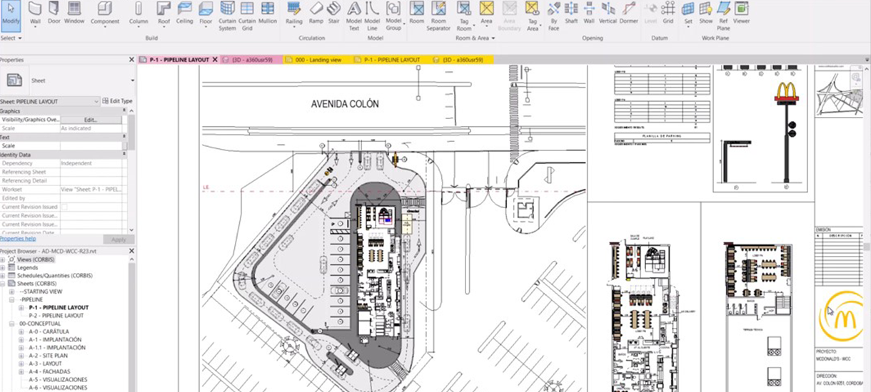 Using Revit, we placed all these elements in the correct positions and studied how they fit with the environment, the lighting, and the customer flow. In this case, the highway sign, the biggest and most visible, was especially strategic. We could test its size and height, and see how it interacts with the traffic and the building itself. For freestanding or 24-hour stores, this is key to attracting customers and improving sales.
