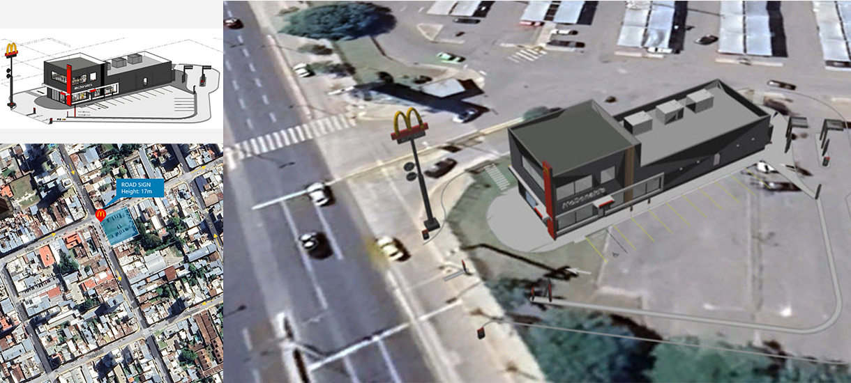 Today, you don't need to guess anymore. With Revit and Google Earth, we can model your building and signage to exact dimensions and place them at their real locations with accuracy. This helps you to see the project from different points of view, whether someone is driving on a highway or walking by the store.